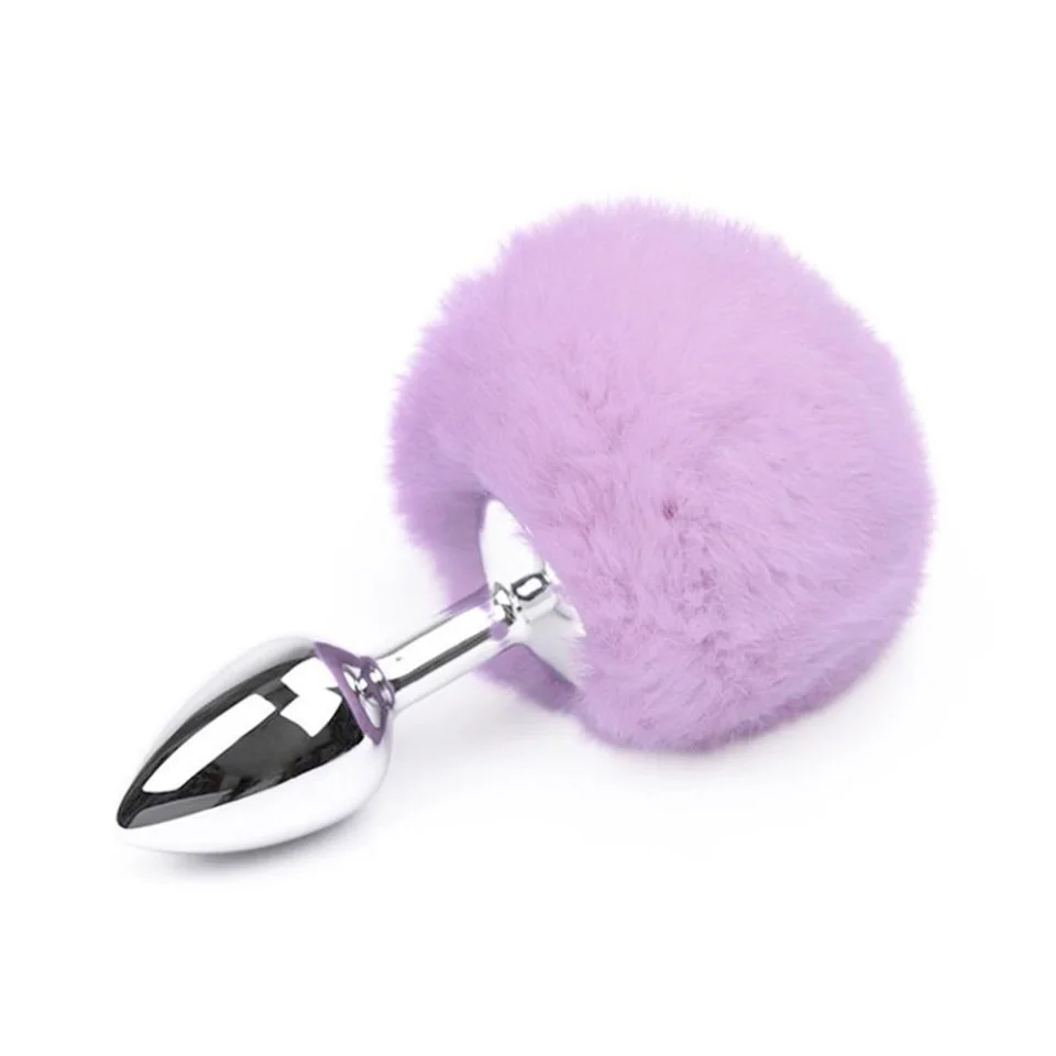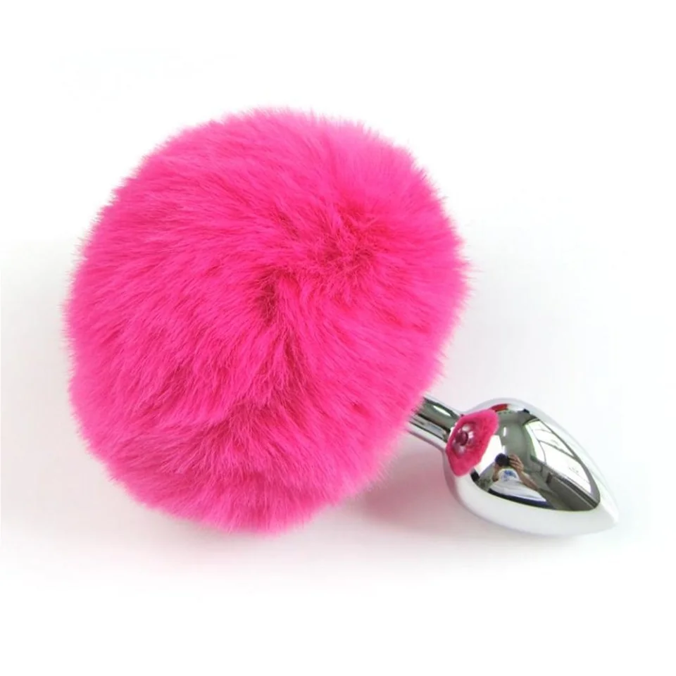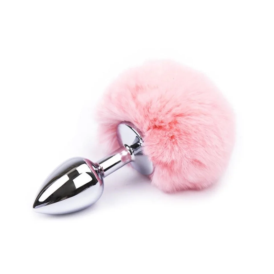 Pürüzsüz ve parlak yüzeye sahip, paslanmaz çelikten yapılmış, arka kısmı tavşan kuyruklu Pembe renkli anal tıkaç (plug).
